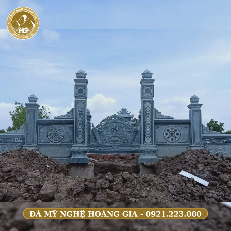 - Hai cột đá chính lớn, điêu khắc hoa văn truyền thống: rồng, hổ phù, sen, chữ Hán.
